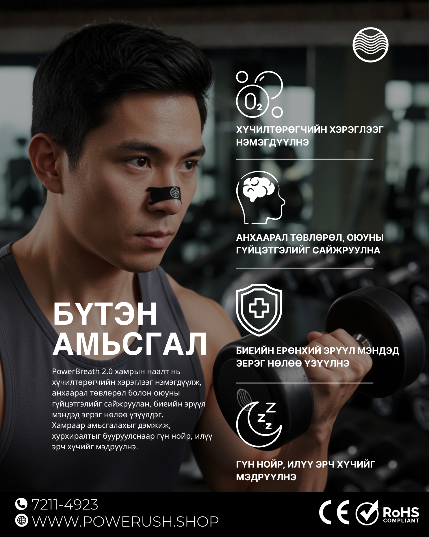 PowerBreath хамрын наалтыг ашиглаад гүн амьсгалах үедээ ялгааг нь мэдрээрэй. Хамрын эсэргүүцэл буурч, хүчилтөрөгчийн урсгал нэмэгдэнэ.